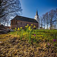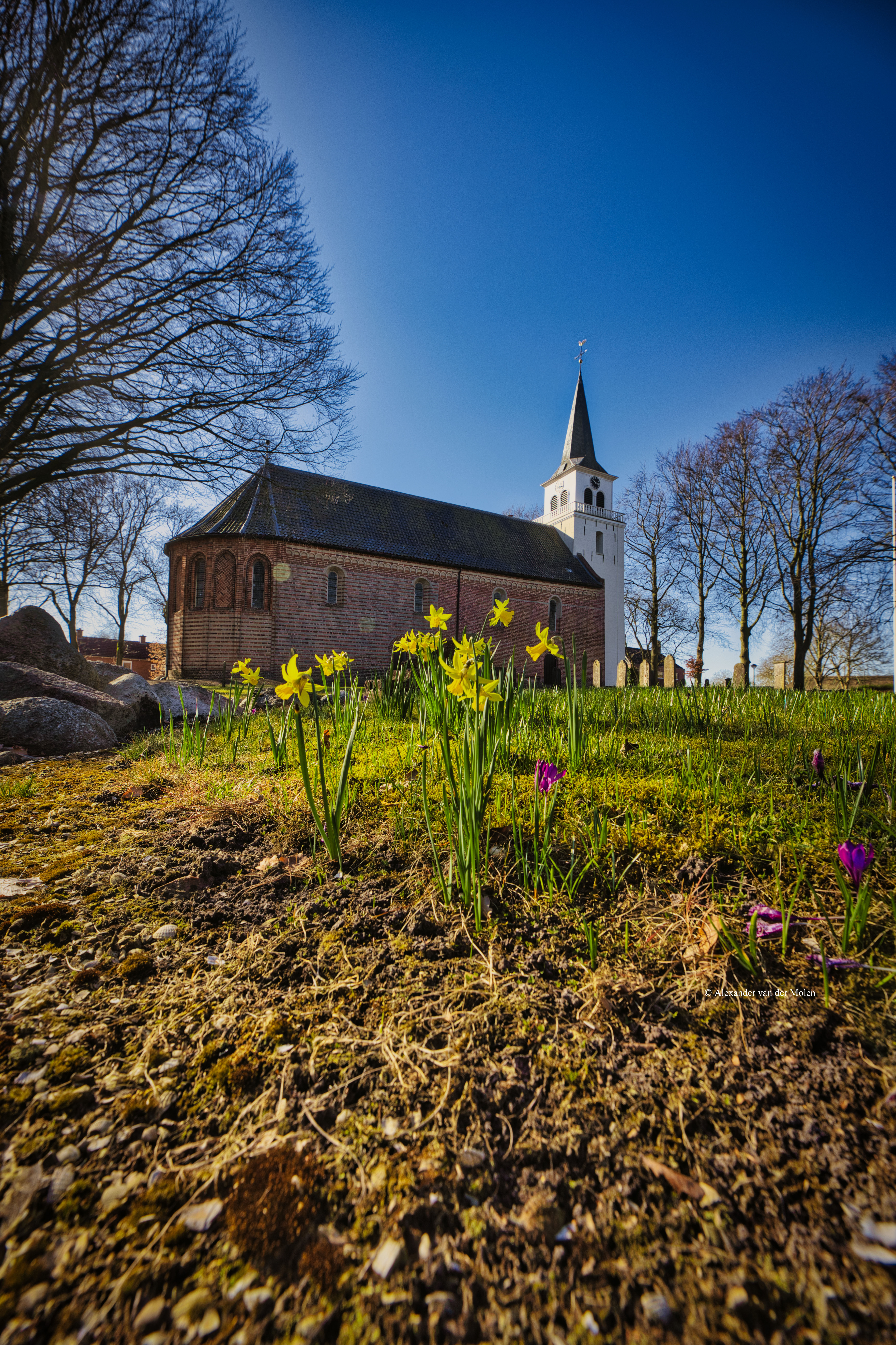 Lentebloemen bij de kerk