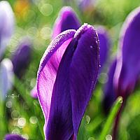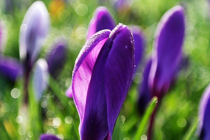 Deze krokussen staan te pronken in het prille lentelicht, honderden mistdruppeltjes lijken het gras te verlichten als kleine lichtjes.