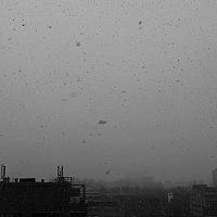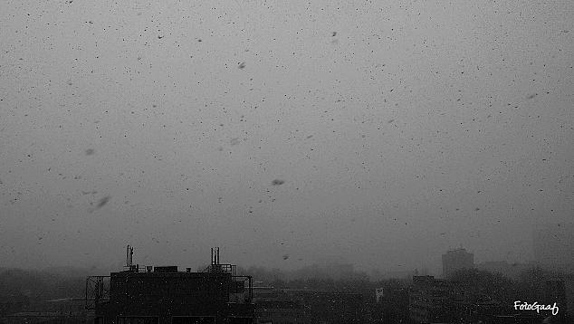 Vanochtend een flinke sneeuwbui, hier het zicht vanaf de 6e etage op de beperkt zichtbare skyline van Delft.