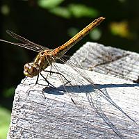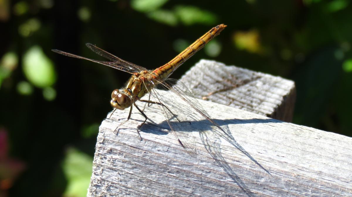 Achterin de tuin, vleugels opwarmend, heb ik deze foto genomen. Hij kijkt mij aan en blijft geduldig zitten.
