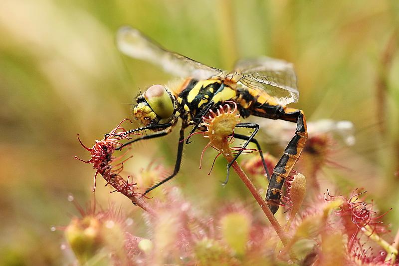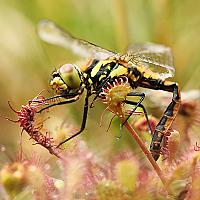 Op pad om het prachtige plantje, de zonnedauw, te fotograferen ontdekte ik dat er een libel op zat. Helaas de libel is dood, hij werd leeggezogen door het vleesetende plantje. Toch bizar om te zien, dat zo'n klein plantje die grote libel te pakken kreeg.