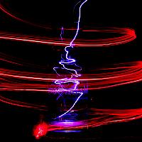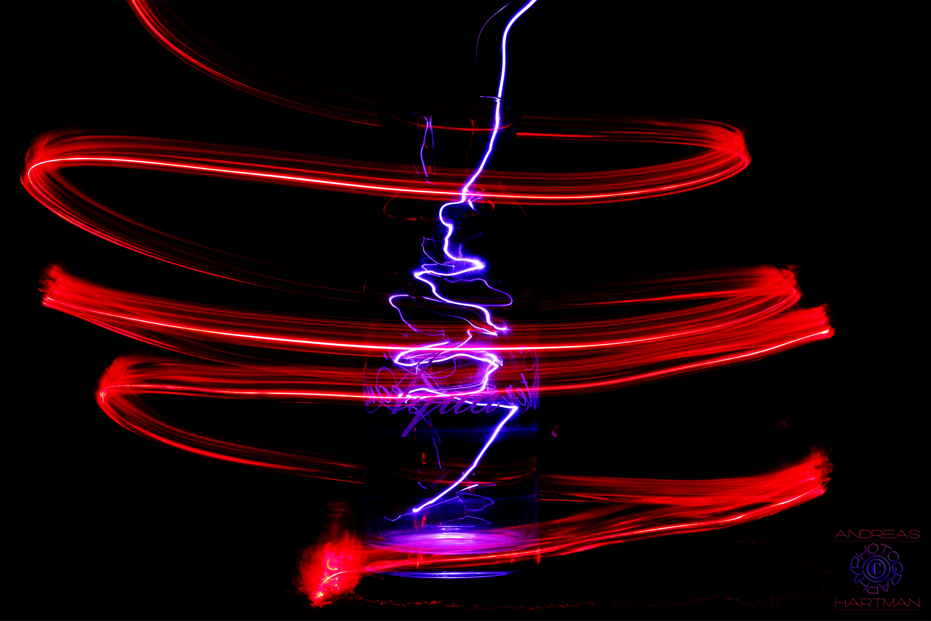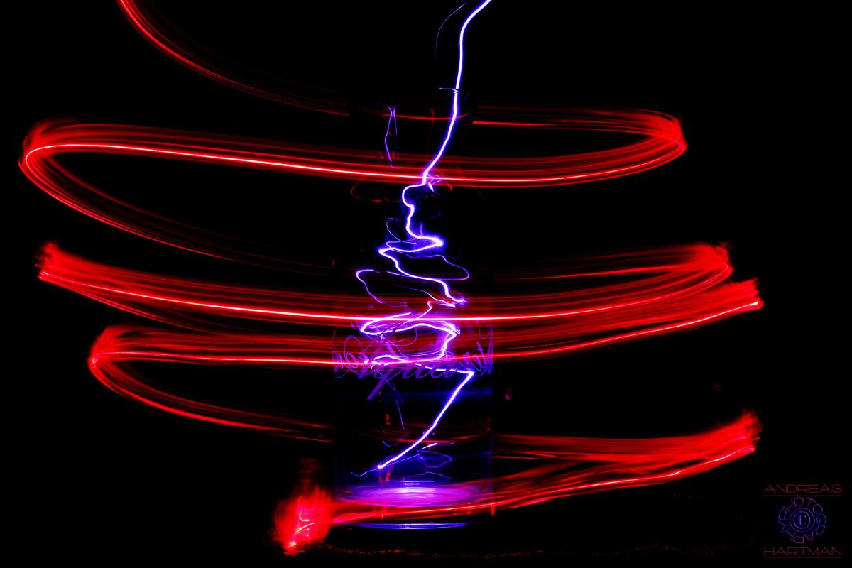 Dit is een foto van blauw en rood licht die in en om een transparante vaas bewegen. Het is 'lichtelijk sensationeel!'