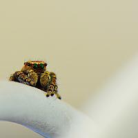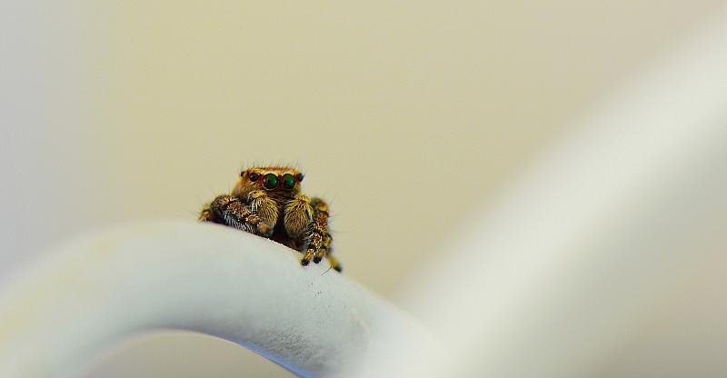Dit lief klein schattig spinnetje, de springspin zat op de kabel van de i-Phone oplader. Snel mijn camera, statief en afstandsbediening gepakt om een foto te maken. Na een zeer vermoeiende fotosessie van wel geteld 2 foto's was de spin gevlogen... Maar gelukkig toch een verbluffend resultaat.