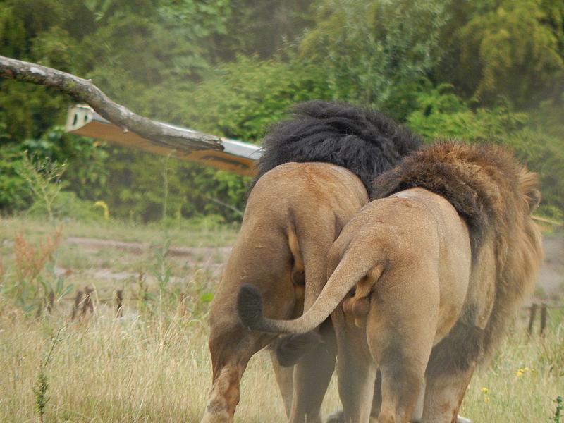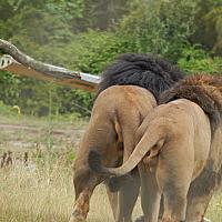 Twee mannetjes leeuwen keren me de rug toe.