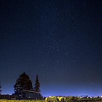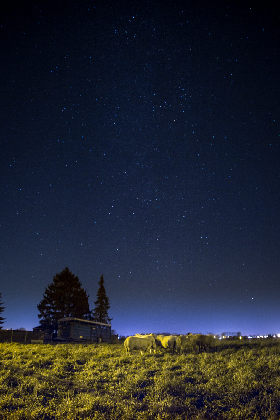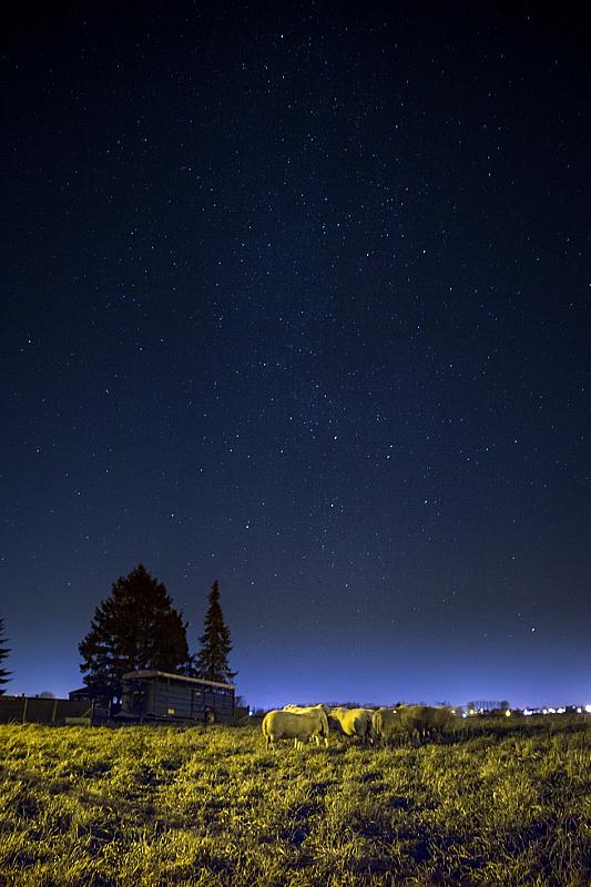 Schapen grazen onder een heldere sterrenhemel/melkweg in Moorslede West-Vlaanderen.