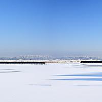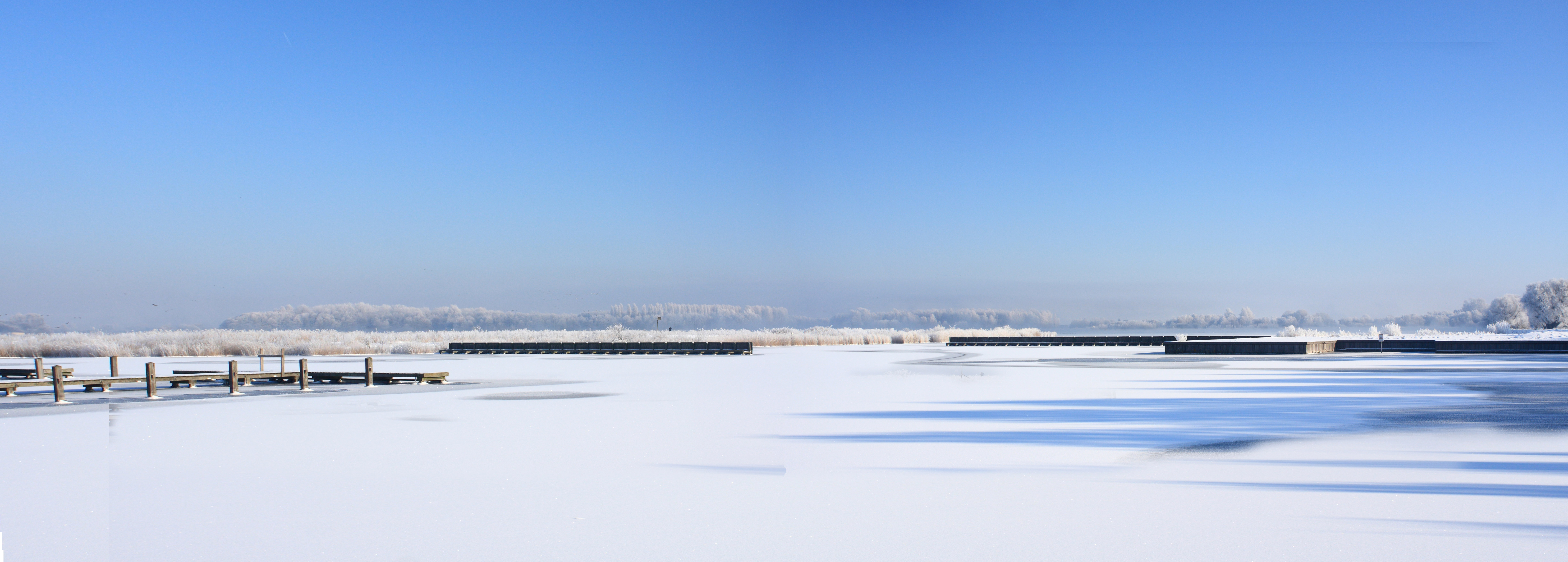 Het lijnenspel van de steigers in het water geeft een mooie diepte aan het witte bevroren meer