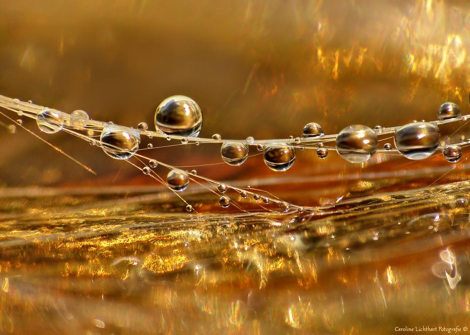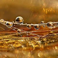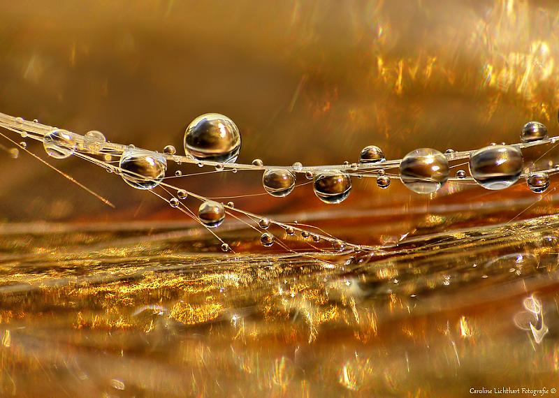 Distelpluisjes met druppeltjes in het gouden licht van de zon.