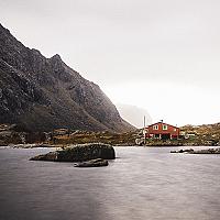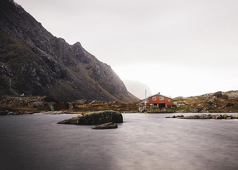 Long exposure photograph of a lonely fisherman's house on a small island has been taken on a beautiful autumn day on Lofoten Islands, Norway.
