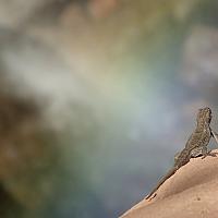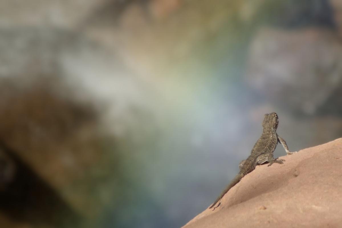 Deze hagedis zat op een rots te kijken naar het prachtige 'Emerald Lake' in Zion National Park. De mist van de waterval geeft een regenboogachtige waas in de achtergrond.
