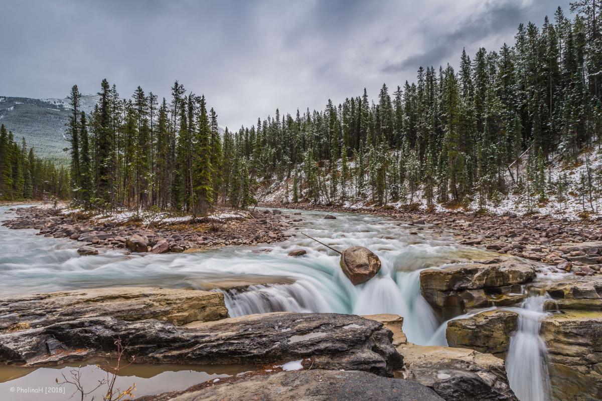 De rots in het midden van de waterval met de beknelde boomstam doet mij aan een lolly denken.