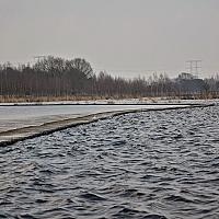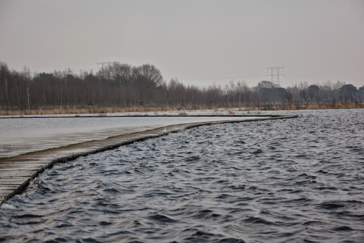 houten looppad door het water in natuur gebied bij huis ter heide, vind de scheiding met het water appart, kleine golven en onstuimig en de andere kant vlak.