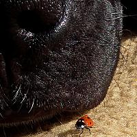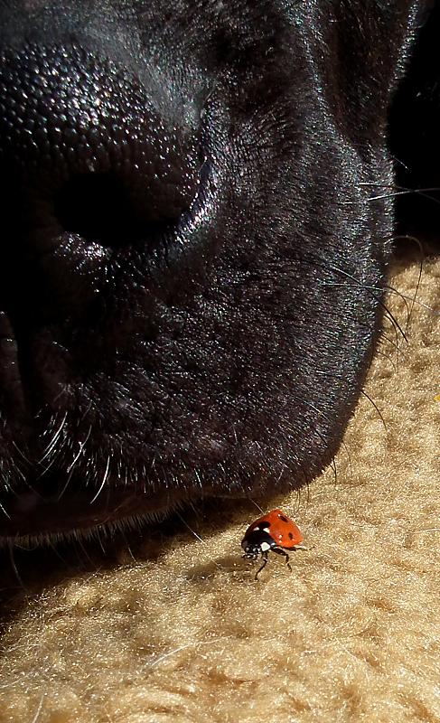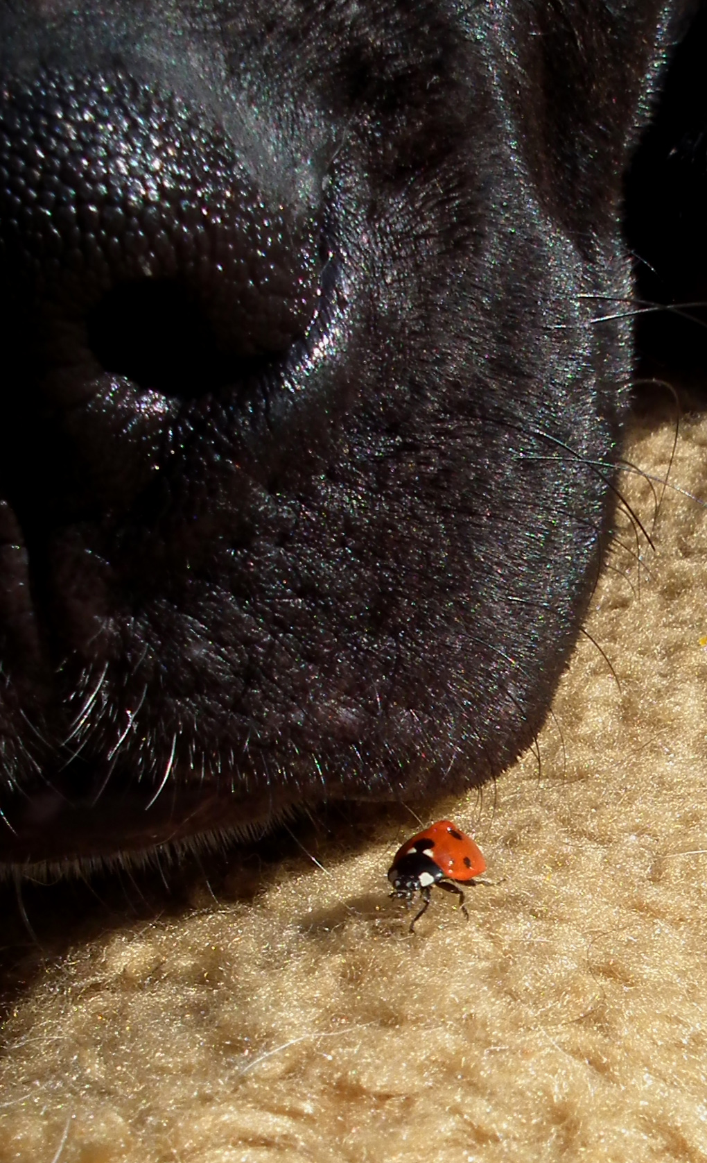Google lag te slapen in de lente zon terwijl een lieveheersbeestje nieuwschierig kwam kijken
