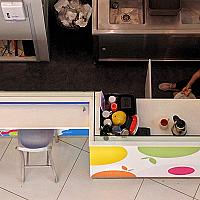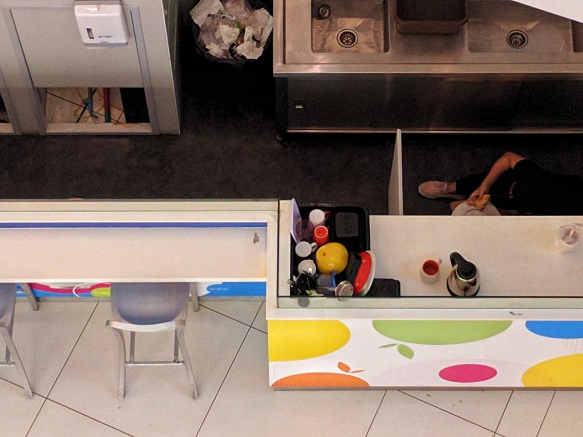 Werknemer in Maleisië moet achter de toonbank nog snel even lunchen.