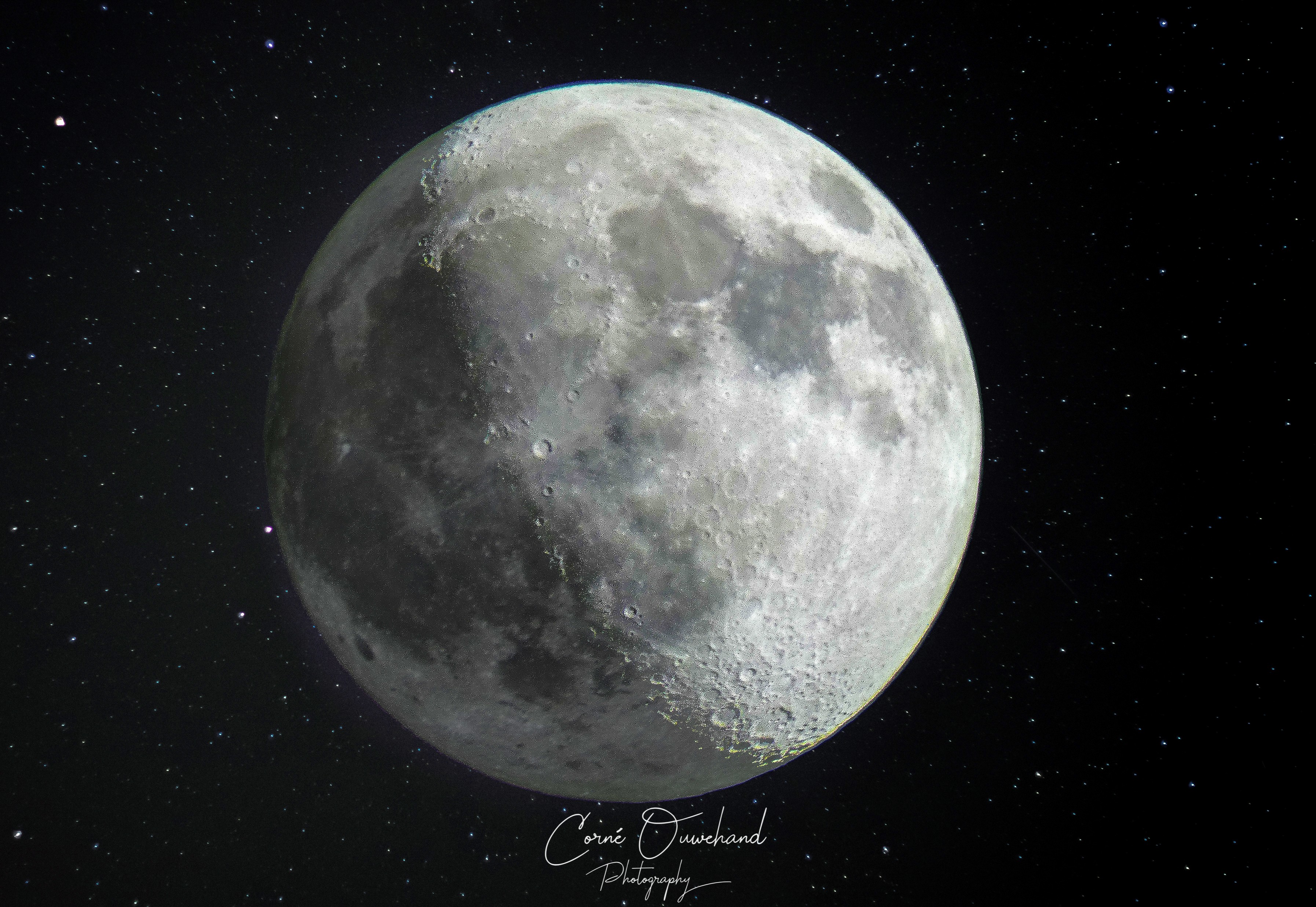 Door een wassende maan (1e kwartier) te combineren met een volle maan krijg je een soort 3D effect doordat de kraters nu zichtbaar zijn die je normaal gesproken niet ziet bij een volle maan. (Je ziet ze wel, maar zonder schaduw).