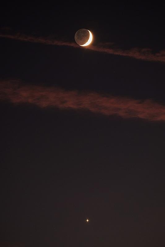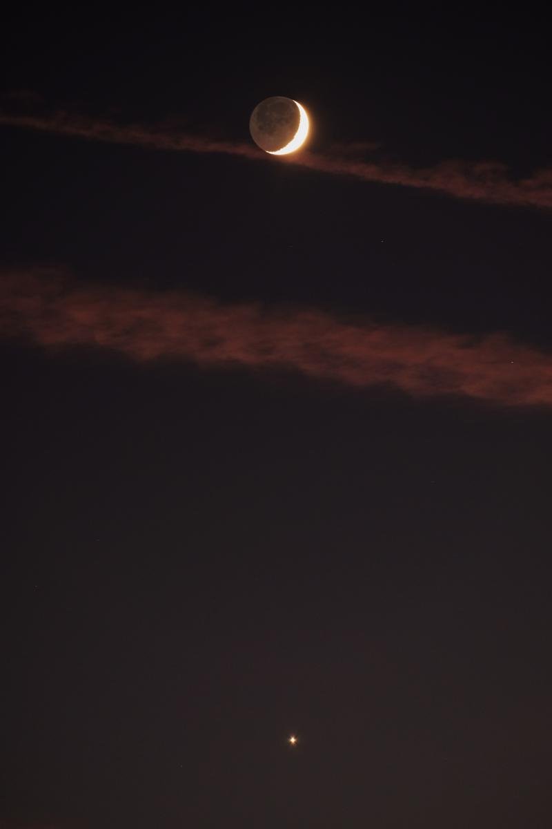 Foto is genomen op zaterdag 3 december 2016. Venus stond bijna recht onder de maan, die een mooie schijngestalte (earthshine) had.
