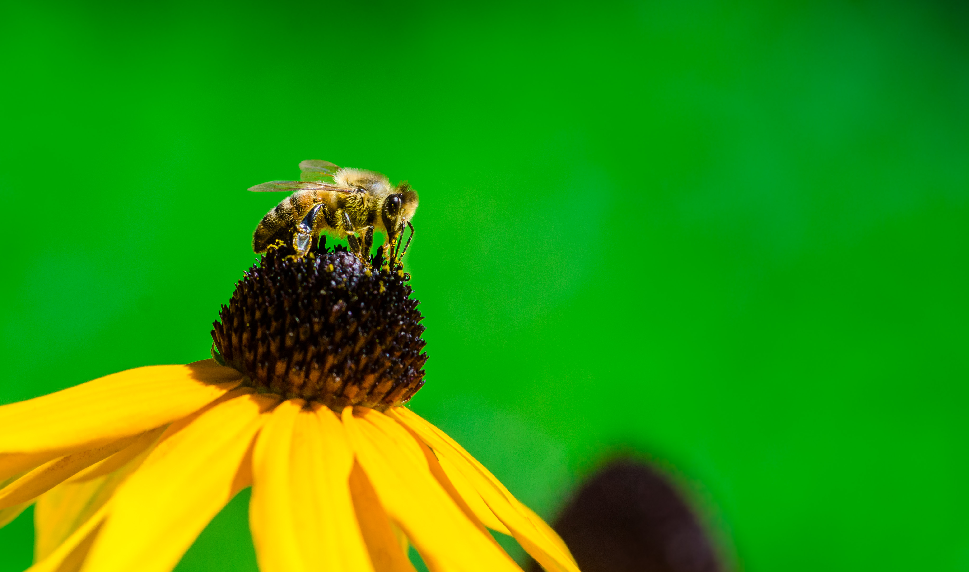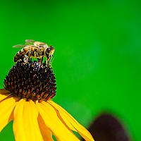 een macro foto van een bij op een bloem met groen erom heen.
