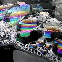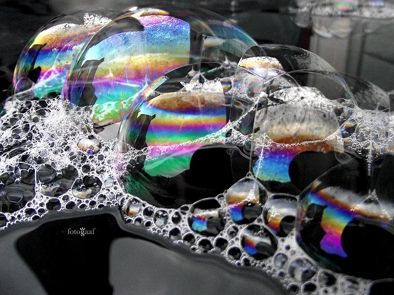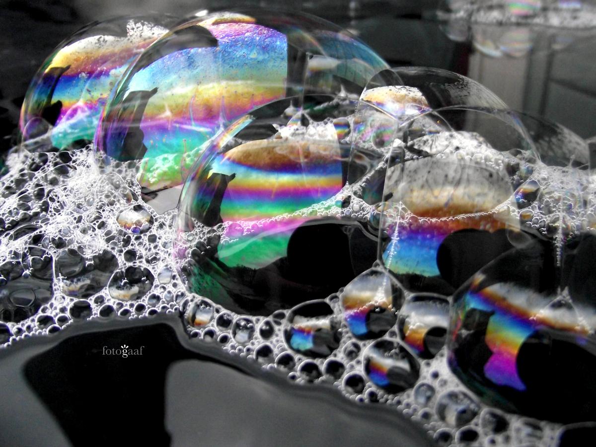 Nog een andere foto uit de zeepbellenserie: bellen zoeken elkaar graag op om lekker samen te zijn ;-) Prachtig om naar te kijken, die bellen die steeds maar in beweging zijn waardoor je iedere seconde een nieuw kleurpallet en andere lijnen en vormen ziet. Of het nou een grote bellen of de minibelletjes zijn :)