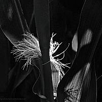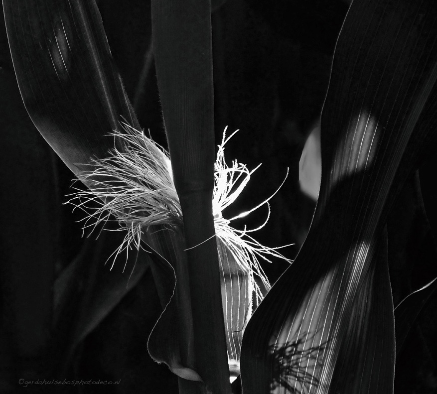 Het zonlicht achter de hoge maisplanten kiekte net tussen deze bladeren door op de witte pluim en gaf een mooi silhouet mee op het ervoor liggende blad.