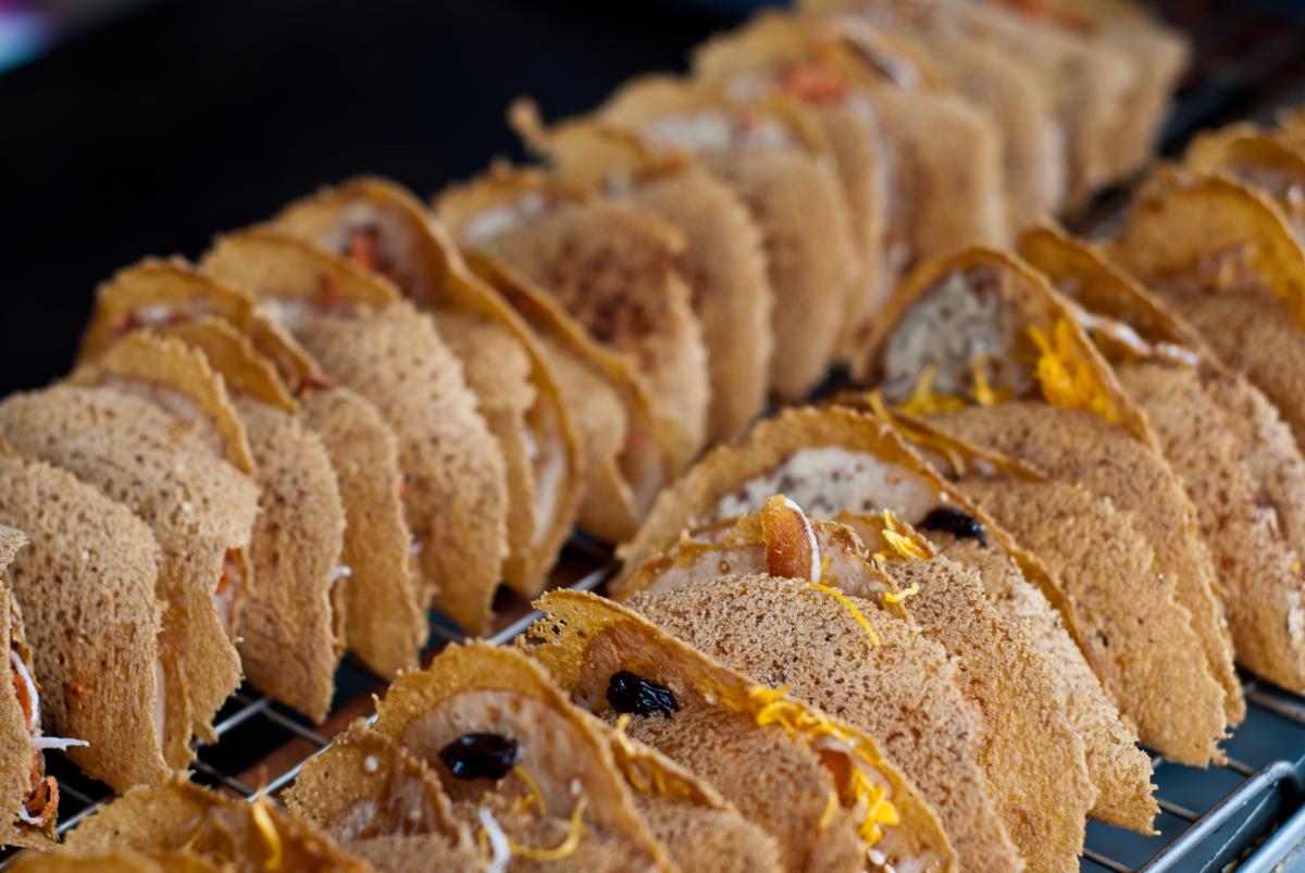 Snacks die wel wat op krokante, zoete taco's leken werden op veel plekken verkocht in Bangkok
