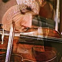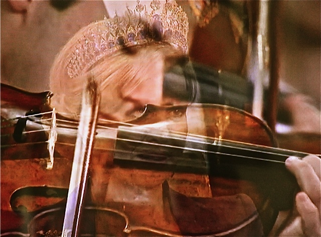 Koningin Maxima luistert aandacht naar de muziek, die een violist speelt.