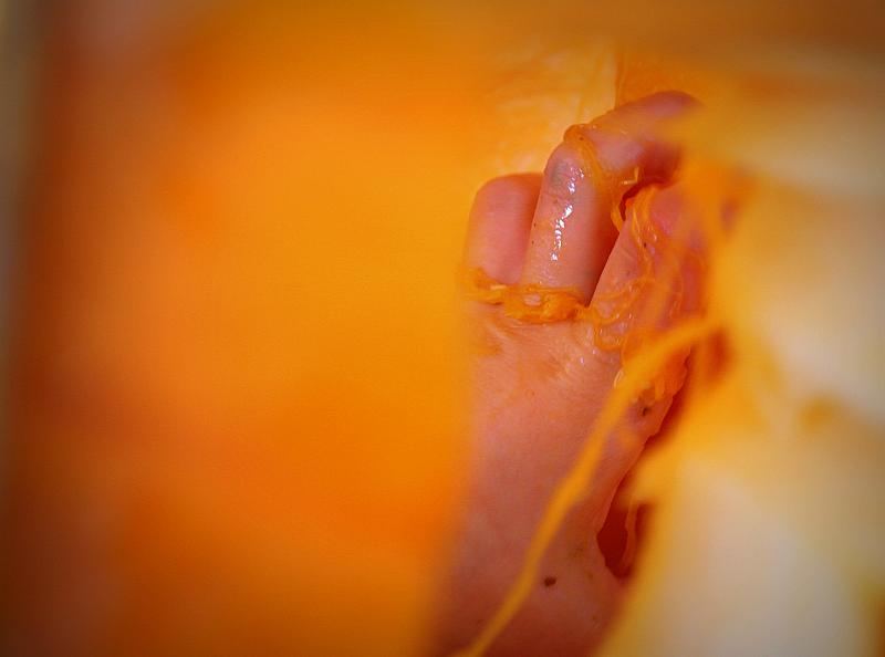 Pompoenen snijden en versieren is een serieuze aangelegenheid volgens mijn zoontje. Uithollen? Dat doe je gewoon met je blote handen totdat het laatste pitje uit de pompoen is verdwenen.