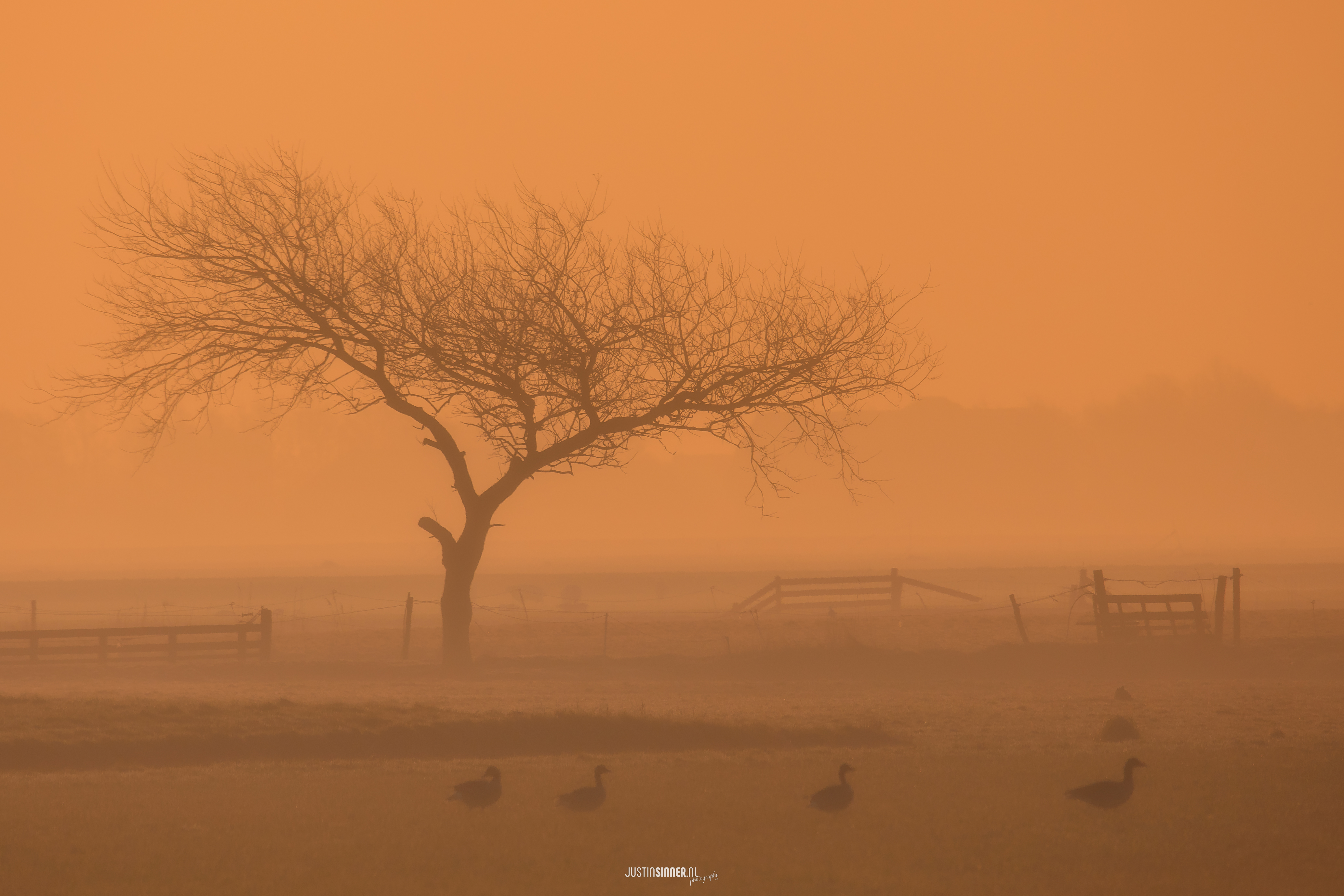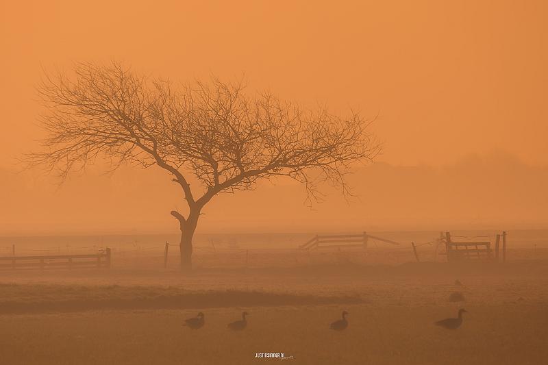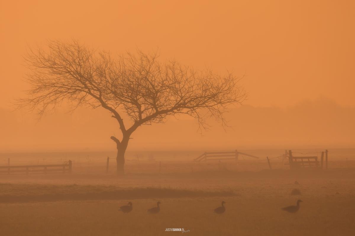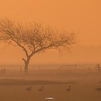 De afgelopen ochtenden is het mistig en dat maakt de landschappen anders dan anders, deze boom staat in de Westen, ben er al 1000000 keer langs gereden en viel mij niet op... nu wel, de ochtendzon schijnt door de mist en valt als een oranje deken over het landschap. Een boom, ganzen en een hek... meer heb je dan niet nodig. :)
