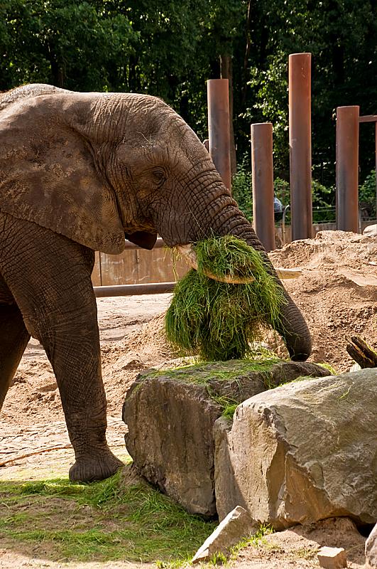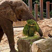 Deze Afrikaanse olifant pakt zijn verse snack en loopt vervolgens weer naar zijn binnenverblijf.