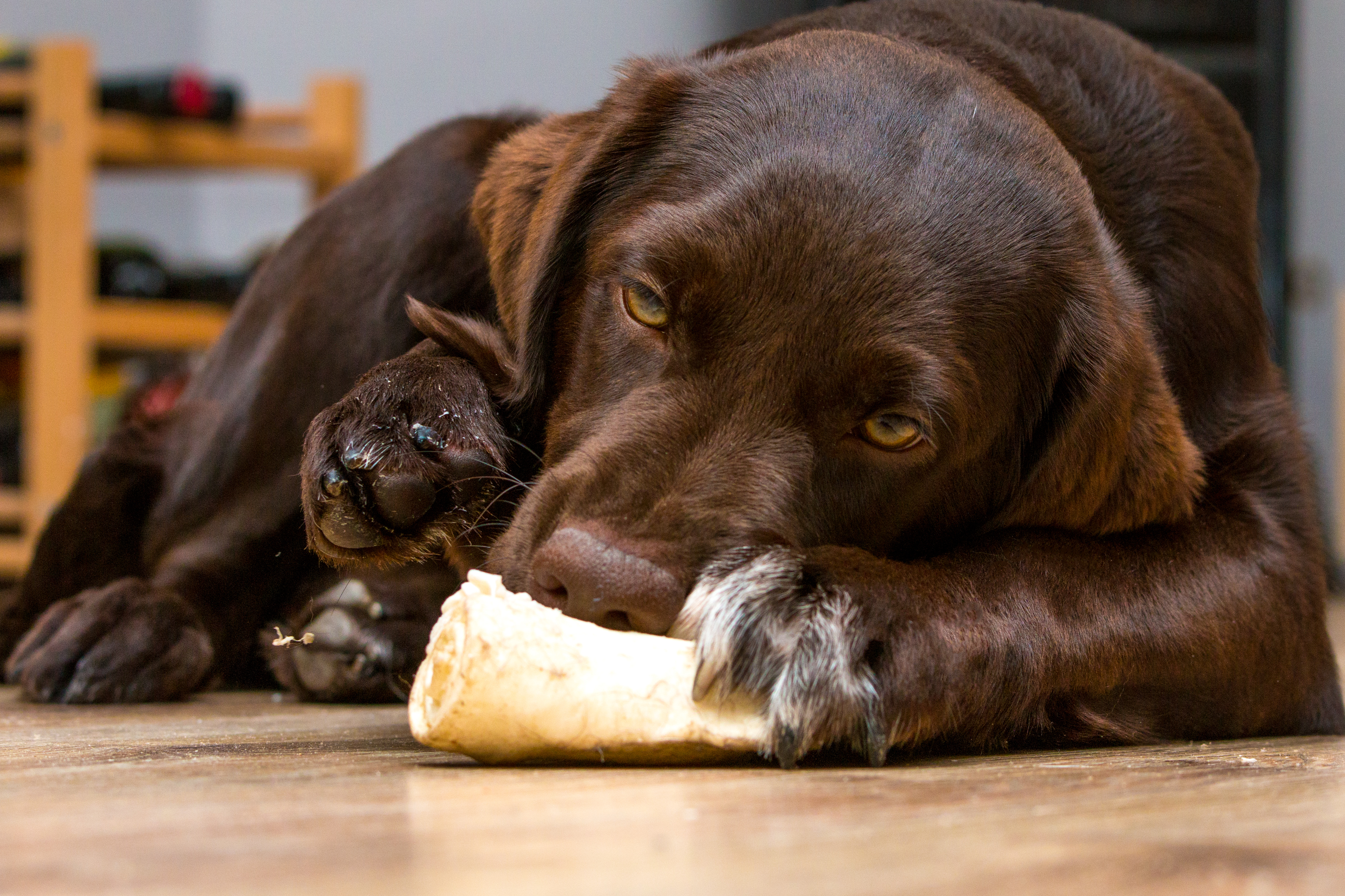 Tijdens het slechte weer was onze pup Mila druk met haar kauw bot, tijdens de shoot beweegt haar pootje met als leuk detail een stukje bot wat stil in de lucht hangt