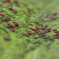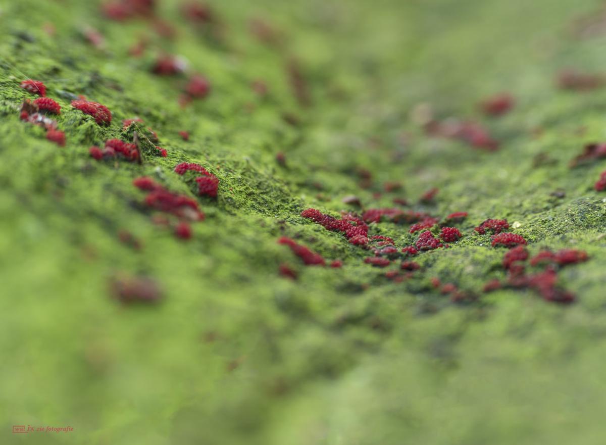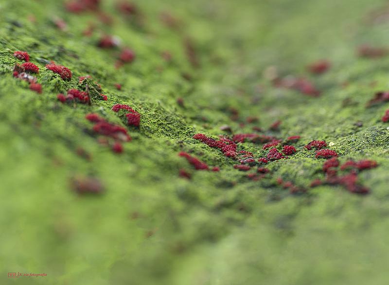 Op een omgezaagde boom, allemaal kleine donkerrode bolletjes....ik heb werkelijk geen idee wat het is, maar ik vond het wel erg mooi, en fotogeniek zo in de holte van een omgezaagde boom.