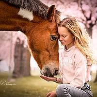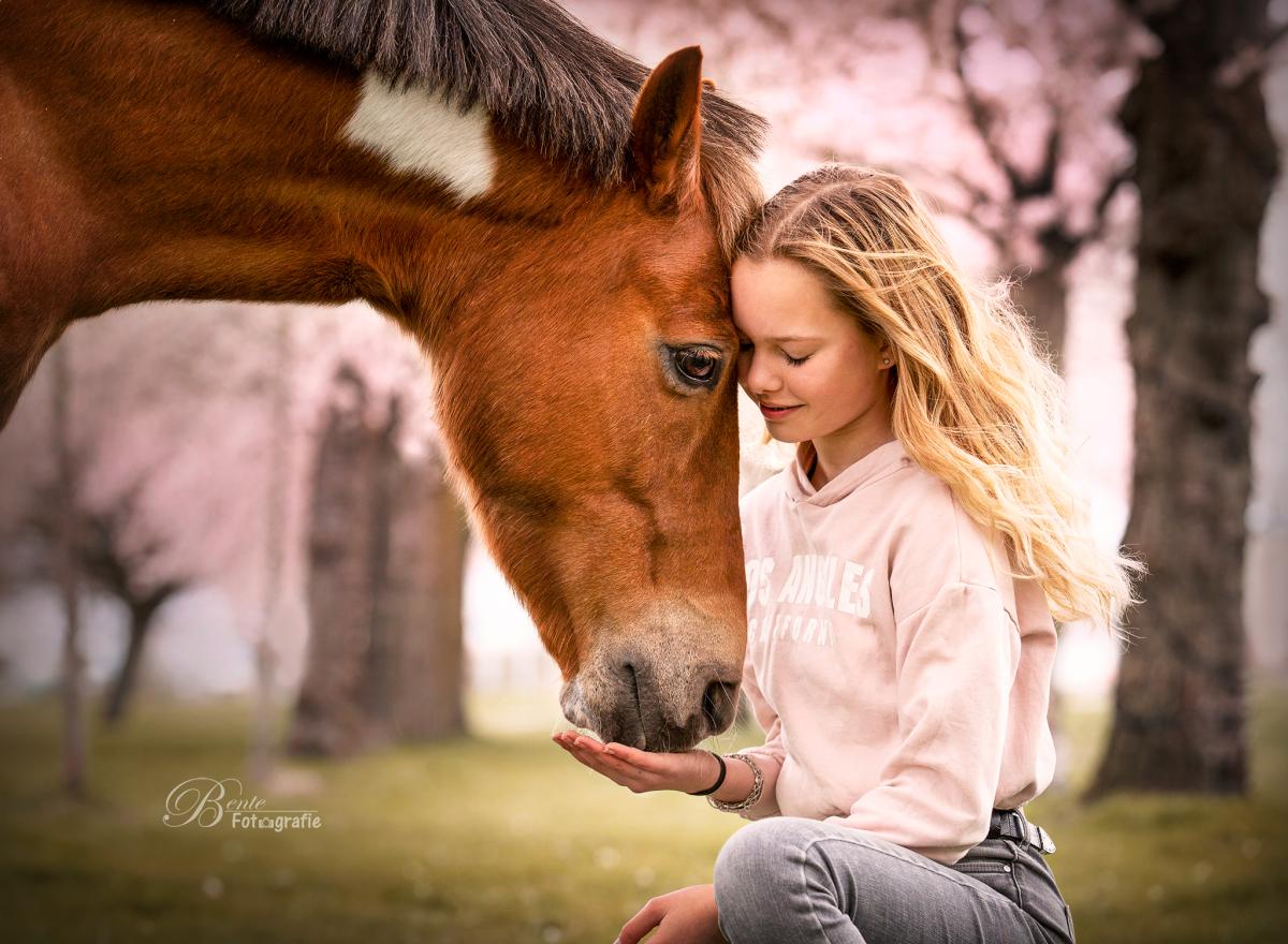 Mirte met haar lieve pony onder de bloeiende bloesembomen