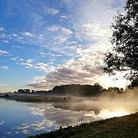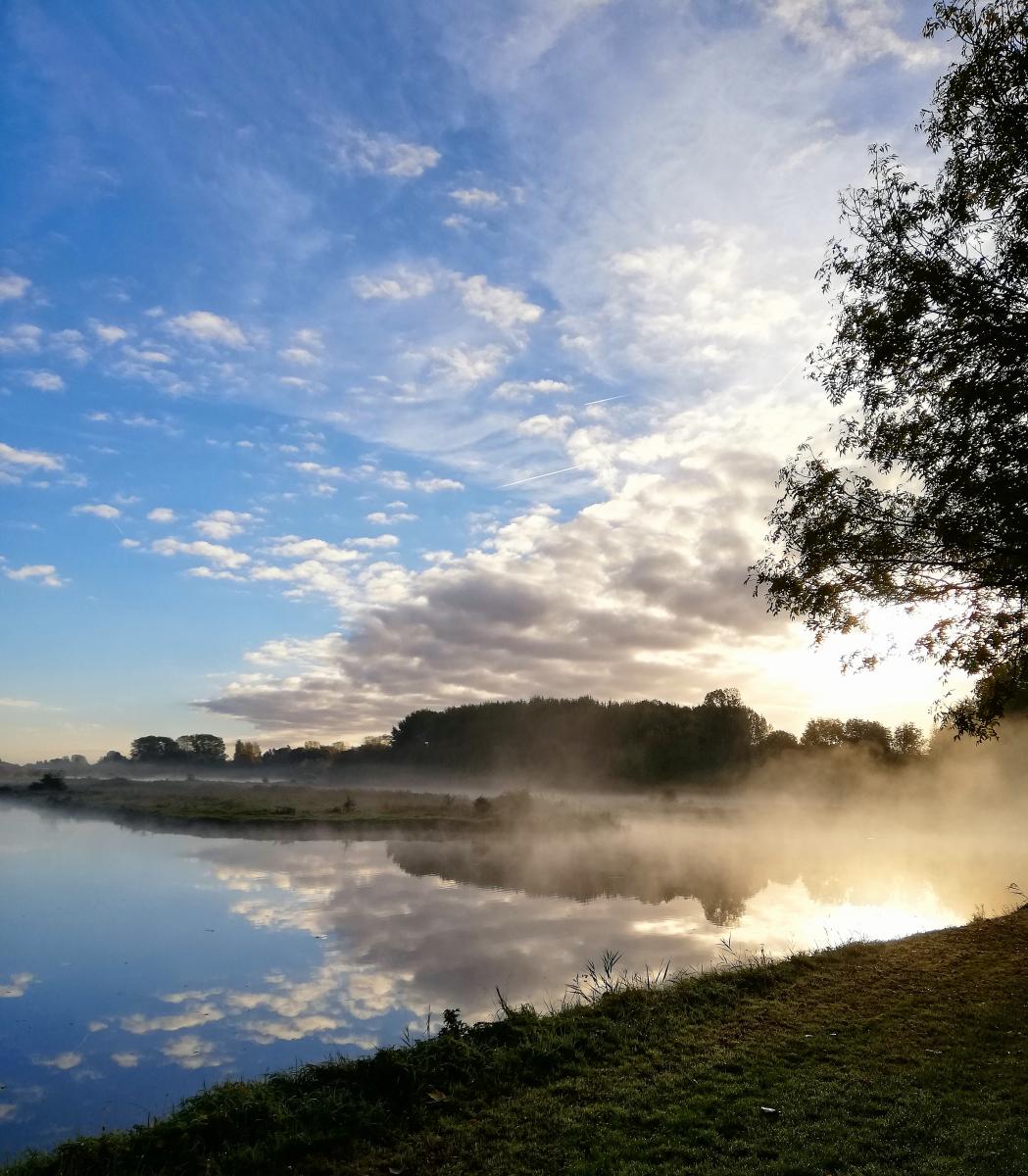 Mist over de natuurplas, twee soorten water met een prachtige wolkenpartij erboven.