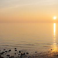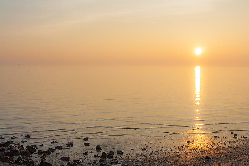 Foto van een mistige zonsondergang op Ameland.