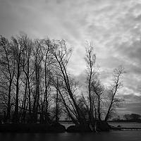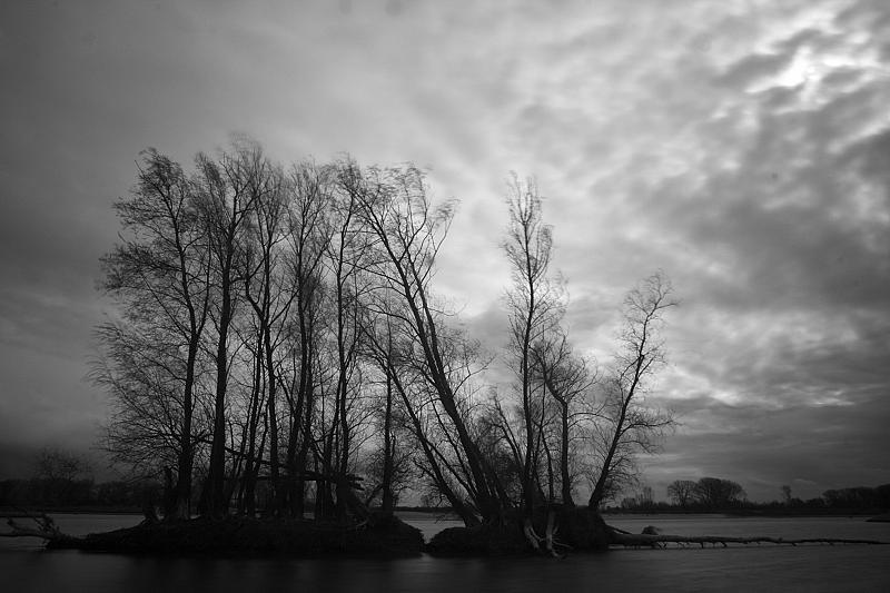 Deze bomen staan in de rivier de Waal bij Gendt. Het water heeft het meeste zand weggespoeld, ze staan nog op een klein eilandje. Links en rechts zijn bomen omgevallen toen hun wortels te bloot kwamen te liggen en geen houvast meer vonden.