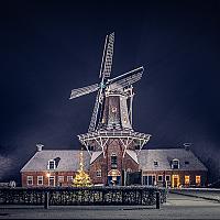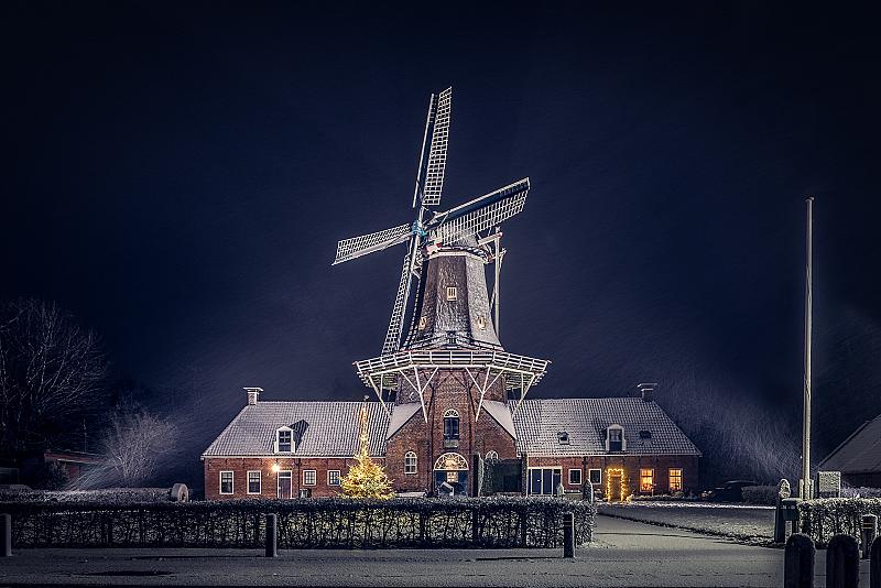 Foto van de molen in Roderwolde tijdens een sneeuwbui.