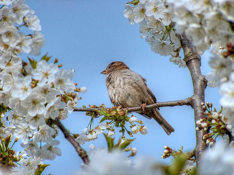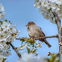 Een musje in de kersenboom die vol met bloesem zit.