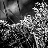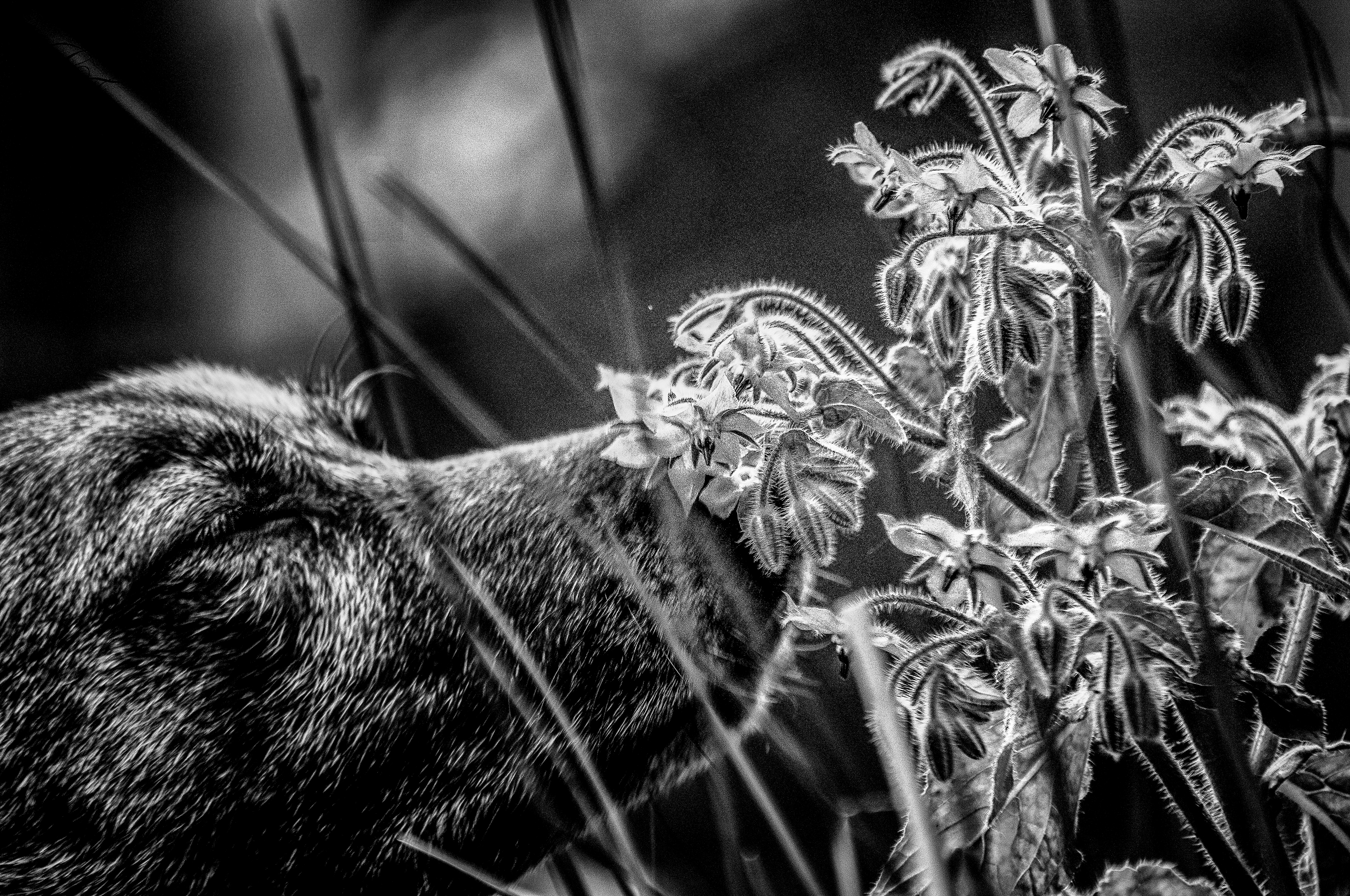 Mijn mechelse herder Myla zit met haar neusje in het komkommerkruid te snuffelen.