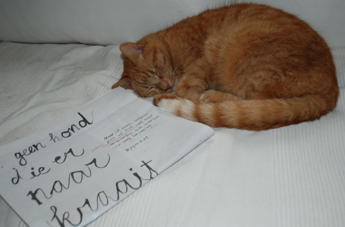 Napoleon neemt mijn plek in na het lezen van de krant.