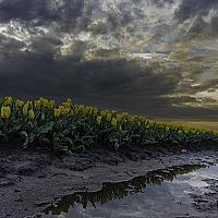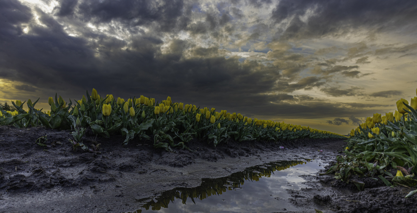 De natte tulpenvelden zorgen wel voor mooie reflecties.