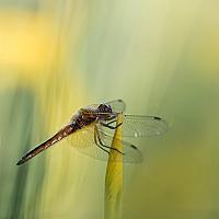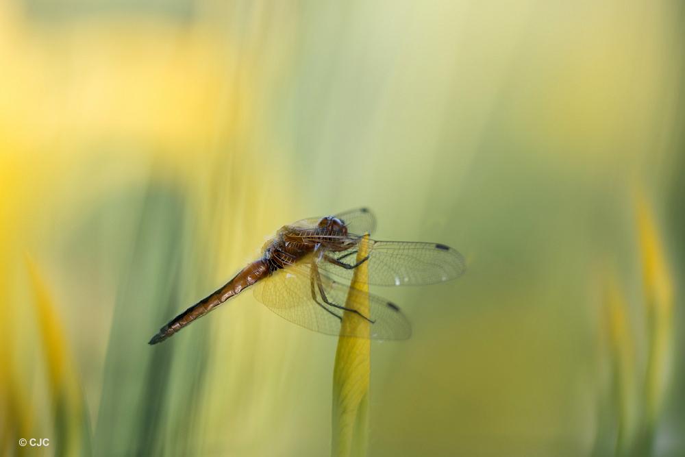 Een libel op een gele lis.