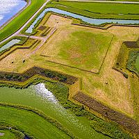 Op deze foto ziet u de restanten van Kasteel de Schans in Ouddorp, Zuid Holland. U ziet verschillende soorten water op deze foto, namelijk een sloot, een gracht en het Grevelingenmeer (linksboven).