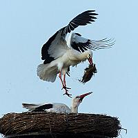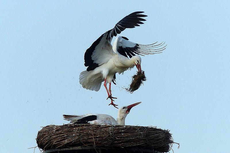 Het is weer lente en daar zijn ze weer: de ooievaars van vorig jaar! Er wordt weer aan het nest gebouwd.