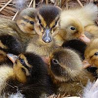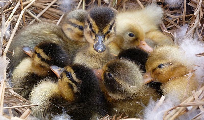 10 eendenkuikens vers uit het ei. Het nest was in de plantenbak voor het huis gemaakt.