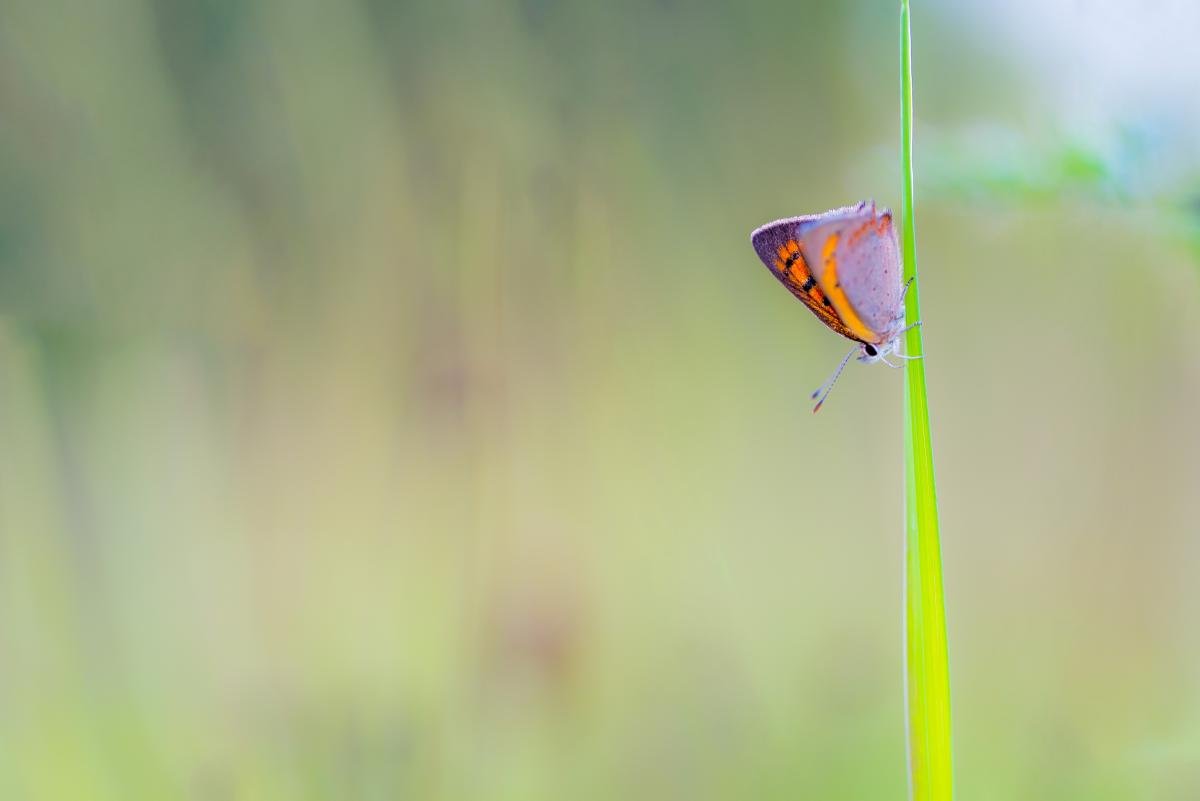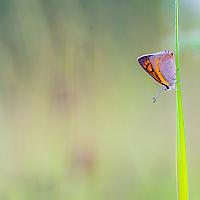 Kleine vuurvlinder laag in het gras voor de nacht