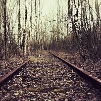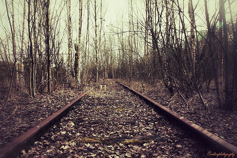 spoor eindigend in een bos, bomen wissen de sporen uit . . .