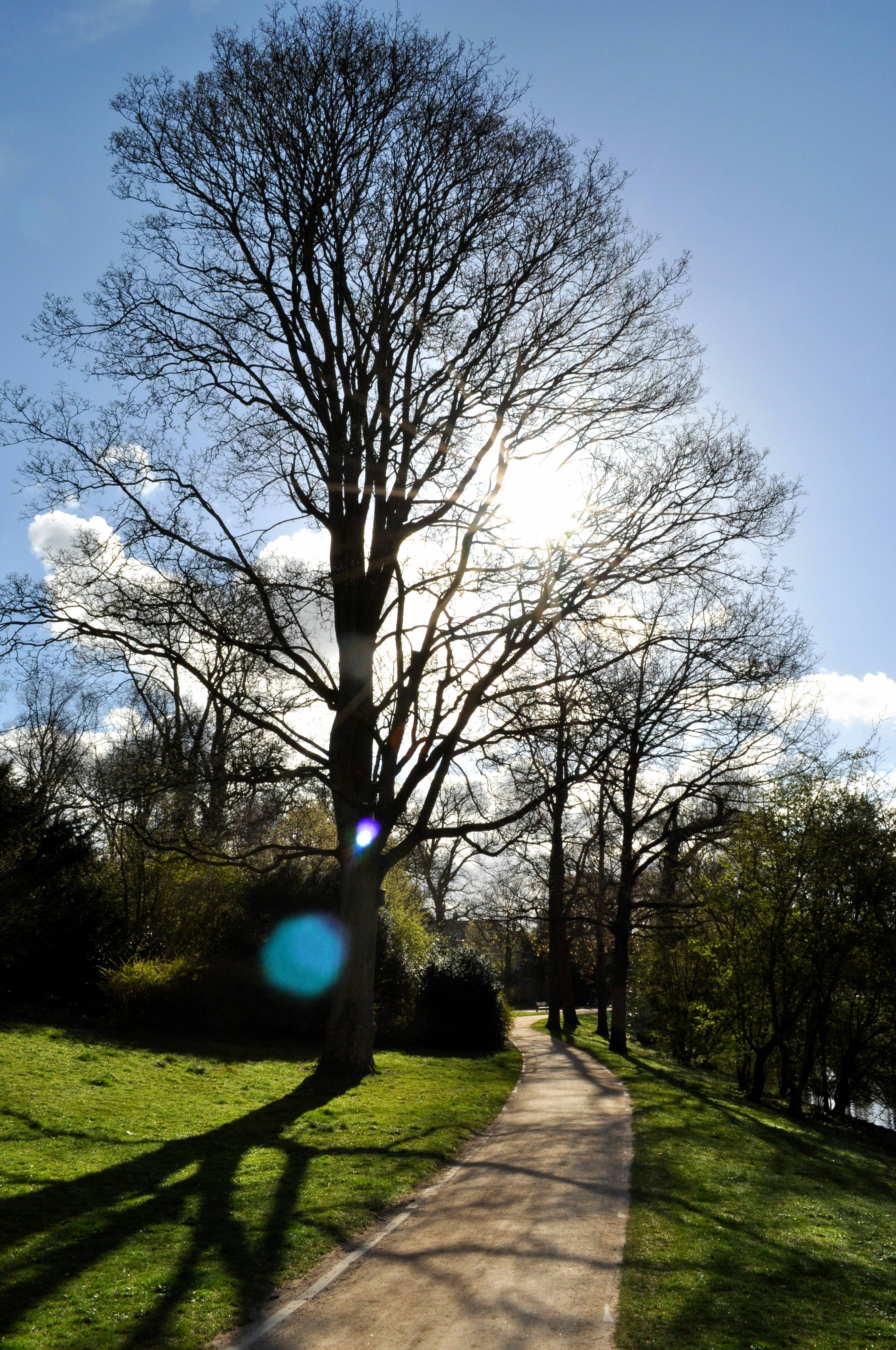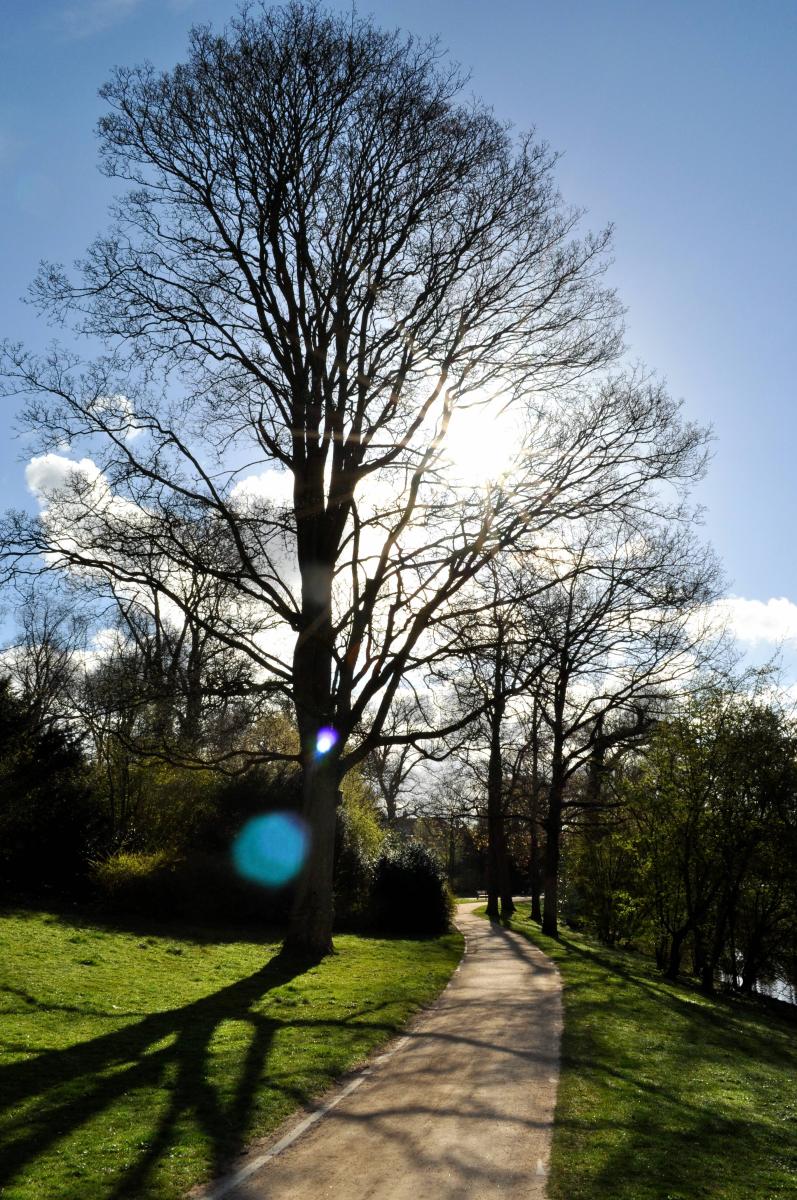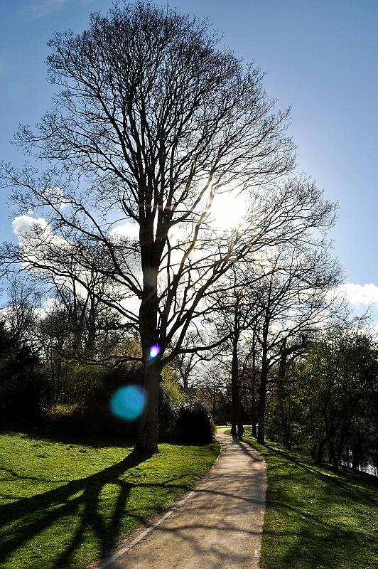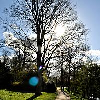 Het Noorderplantsoen in Groningen, met mooi fris lentegroen gras en prachtige bomen.Tegen de zon in gefotografeerd en geflitst om alles niet heel donker te krijgen.