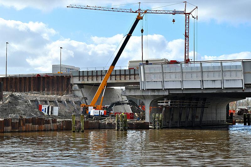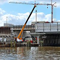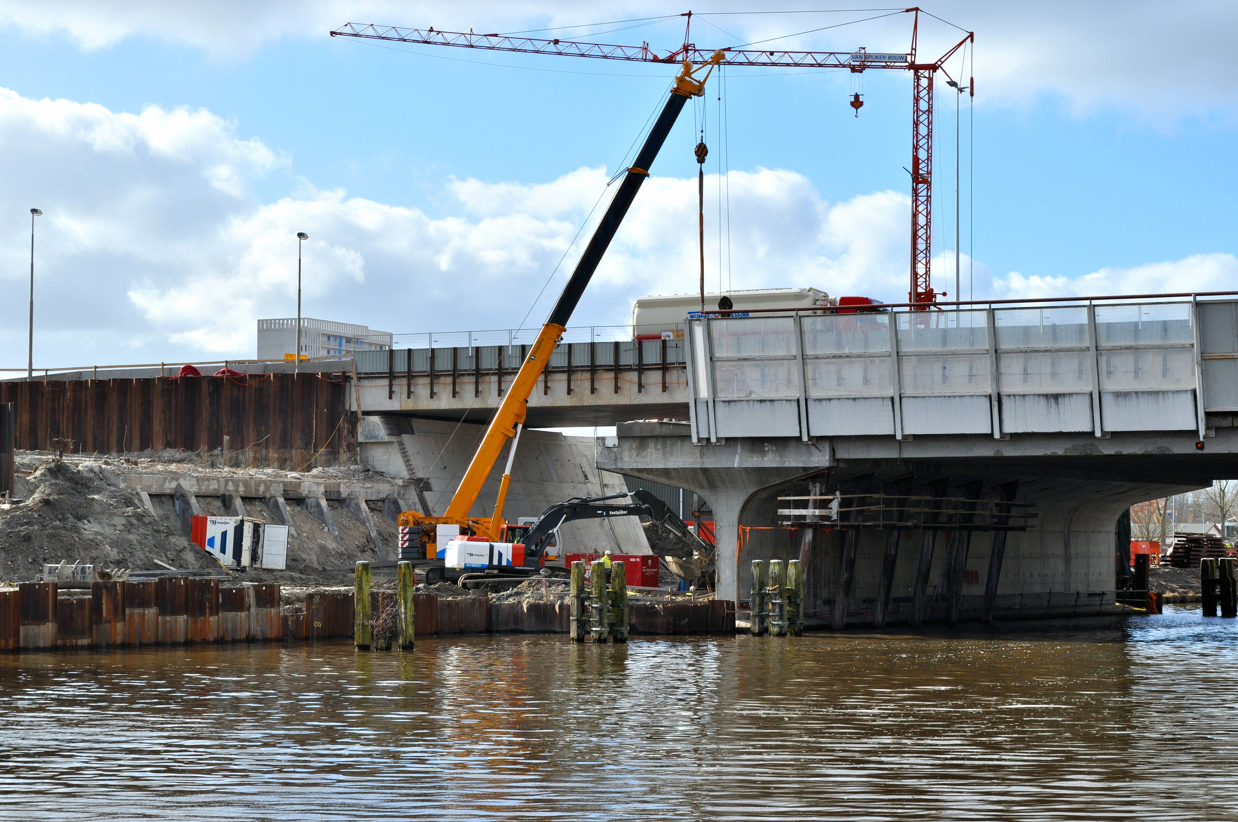 Aanbouw van de nieuwe Noordzeebrug in Groningen. Het stuk vooraan is nog van de oude brug.