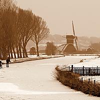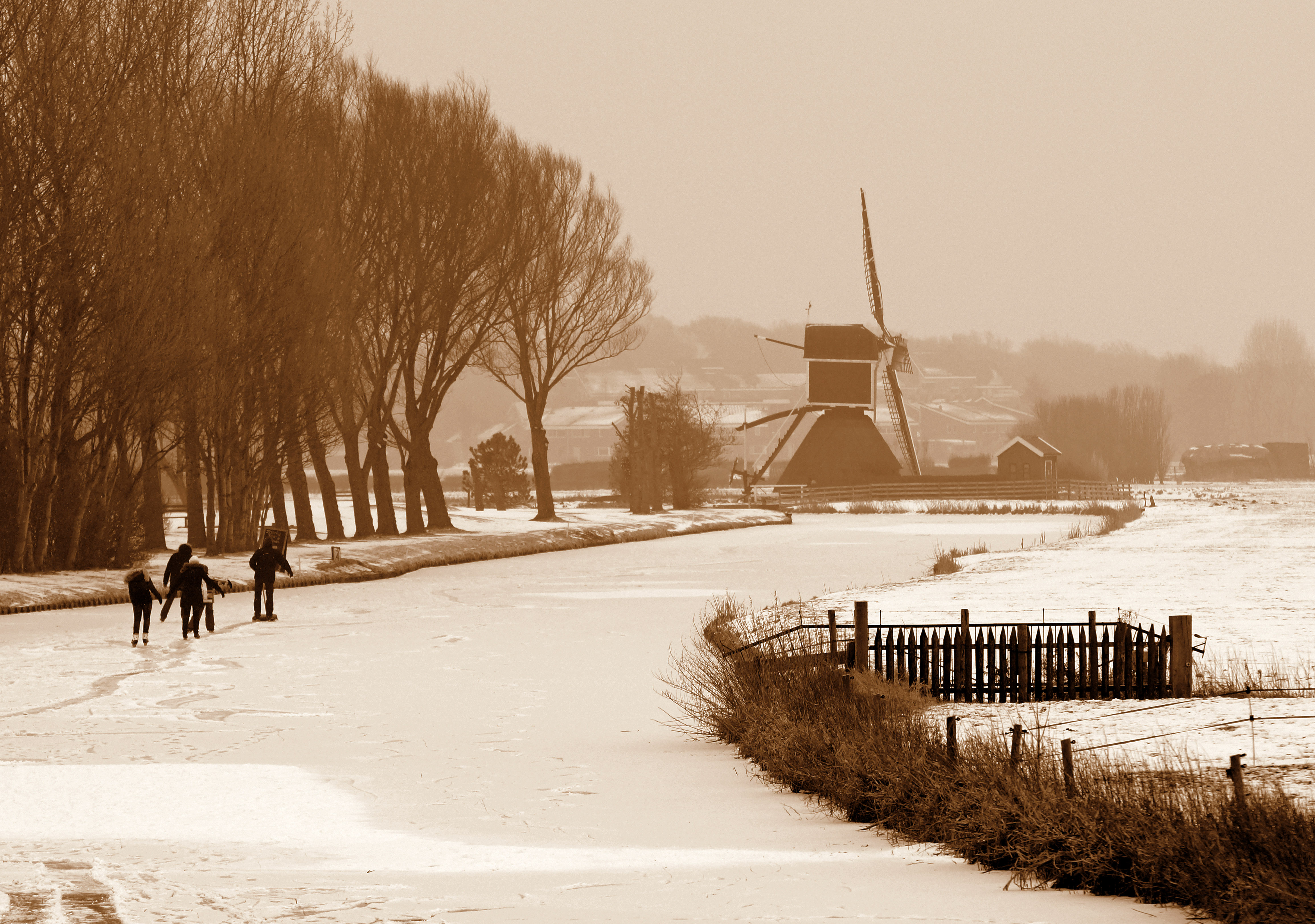 Winter, een polder, een molen en een gezin op de schaats.De foto lijkt uit een oud fotoalbum te komen maar is gemaakt op 12-02-2012
