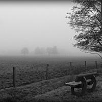 Deze foto is genomen in de mist. Normaal zie je alleen velden en koeien, nu niks! Het was zo rustig.