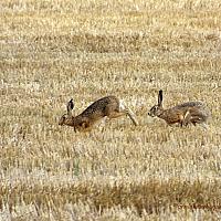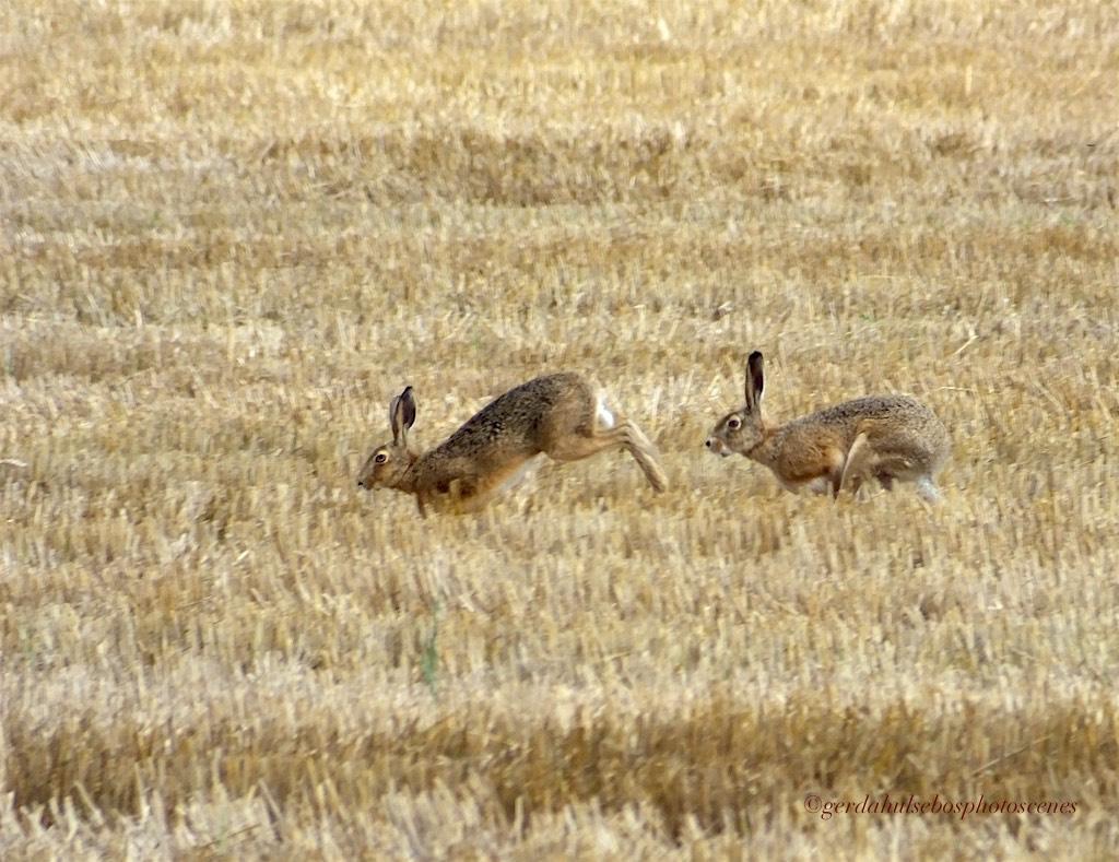 In een gemaaid gouden korenveld spotte ik deze spelende hazen