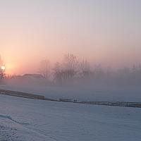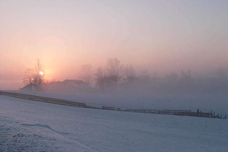Een beetje mist, sneeuw en de opkomende zon. Meer is er niet nodig om het landschap feeëriek te verlichten.